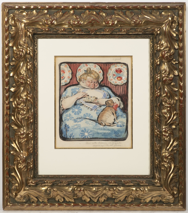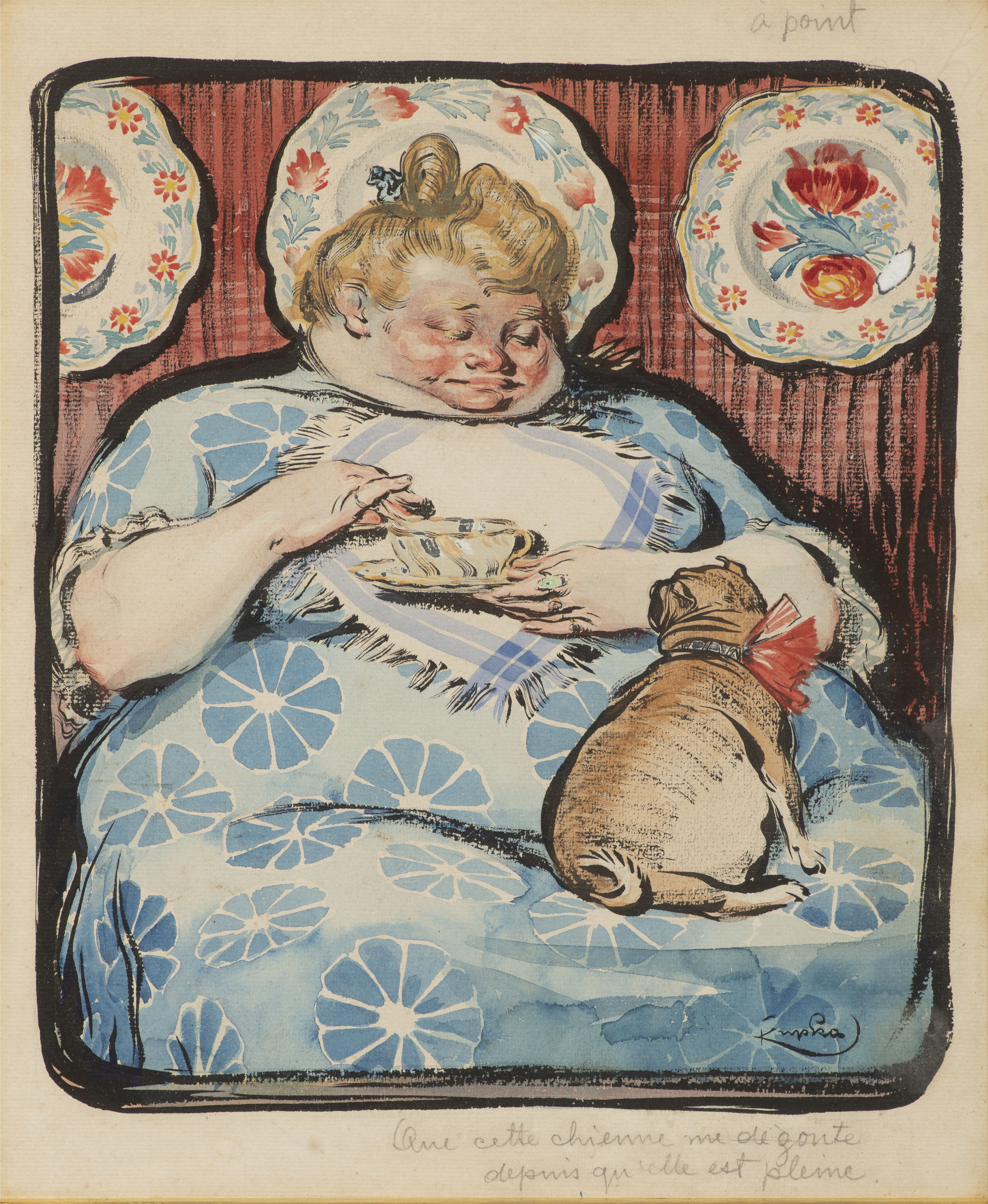 v dolní části obrazu je vlastnoruční přípis tužkou rukou Františka Kupky: „Que cette chienne me degonte depuis quelle est pleine.“ (volně přeloženo: „Že mě tahle fenka štve, protože je březí.“)