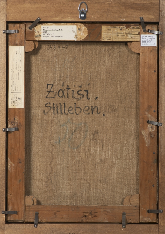 vzadu nápis rukou autora: Zátiší Stilleben 34,8 x 47 a dále štítky Galerie Nationale Prague a Ústředního svazu čs. výtvarných umělců