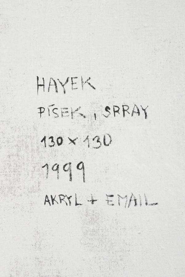 signováno, datováno a popsáno vzadu: HAYEK PÍSEK, SPRAY 130 x 130, 1999 AKRYL + EMAIL